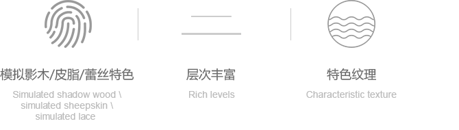 表面结合3D触感工艺技术应用,具有新一代的免漆特色,且呈现超级自然、超强肌理的触感特性。